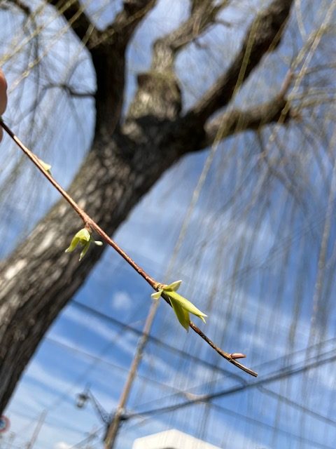 先日散歩中に、道端の柳の木も新芽が出ているのを見つけて眺めていましたら、通りがかりのおじいさまが話しかけて下さいました。子供の頃はこんな柳の木にぶら下がって遊んだもんやーと^^。三、四本をいっぺんに掴んで勢いをつけて川の上を回って岸へかえってくる遊び!は楽しかったようです。柳の木の枝は掴むと掌がベタベタになるらしいです。むかしばなしと豆知識をいただき、むかしの子供の少し危なっかしいですが、楽しい外遊びの様子を想像し楽しいひと時でした。